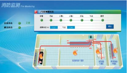 消防系統檢測主要通過采集消防控制器的報警信號或煙感探測器、溫感探測器的報警信號,實時監測火災狀態。當有火警發生,監視系統以直觀的畫面顯示報警信息并作報警通知,采取相應控制措施如打開機房門,并啟停其他相關設備。