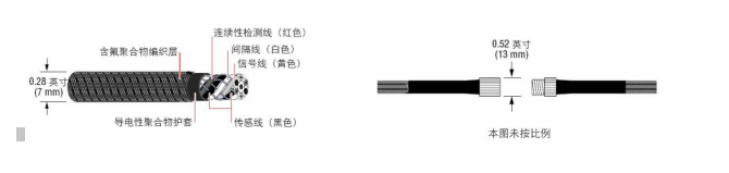 LS-6605 傳感電纜所采用的leadSEN? 油性聚合物技術與含氟聚合物構造使之具有強韌的機械性能與耐化學性能。本電纜由嵌入含氟聚合物載線桿內的兩根傳感線、一根報警信號線和一根連續性檢測線構成。電纜堅固的構造保證無任何金屬暴露,甚至可在腐蝕環境下反復使用。